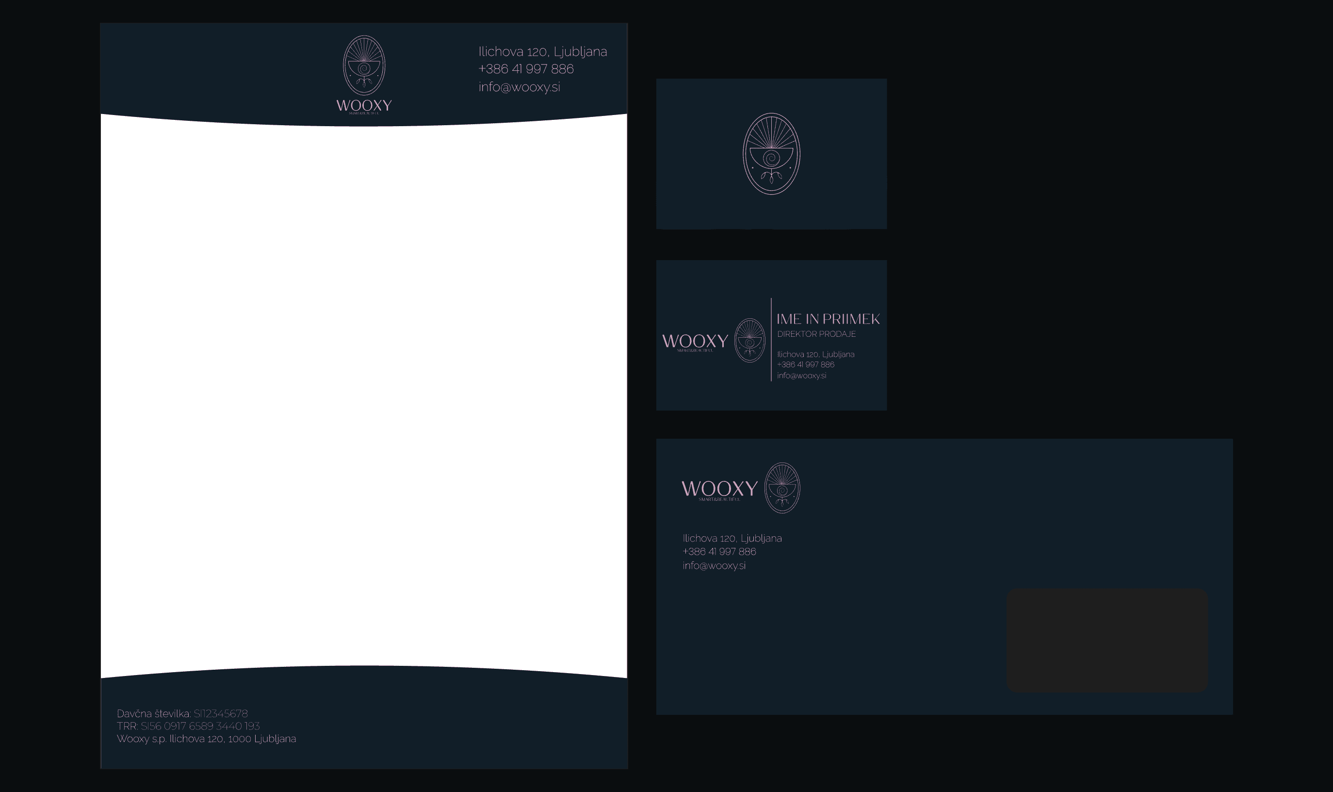 Celostna grafična podoba za Wooxy, znamko ročno izdelanega pametnega nakita z NFC tehnologijo. Zasnoval sem CGP priročnik in vse ključne vizualne elemente, ki omogočajo konsistentno in prepoznavno komunikacijo blagovne znamke ter podpirajo personalizacijo sporočil, shranjenih v nakitu.